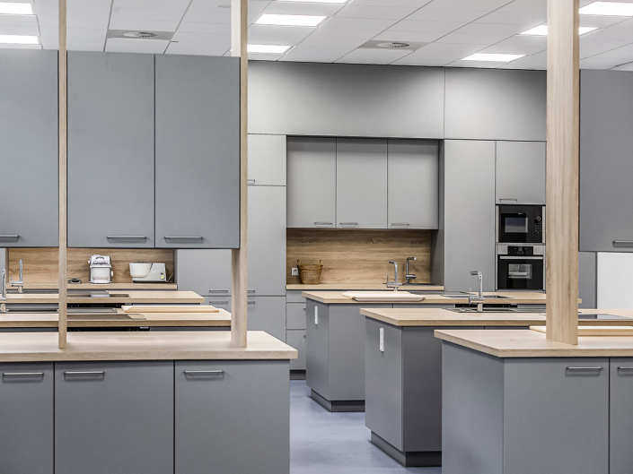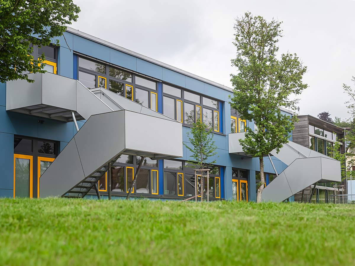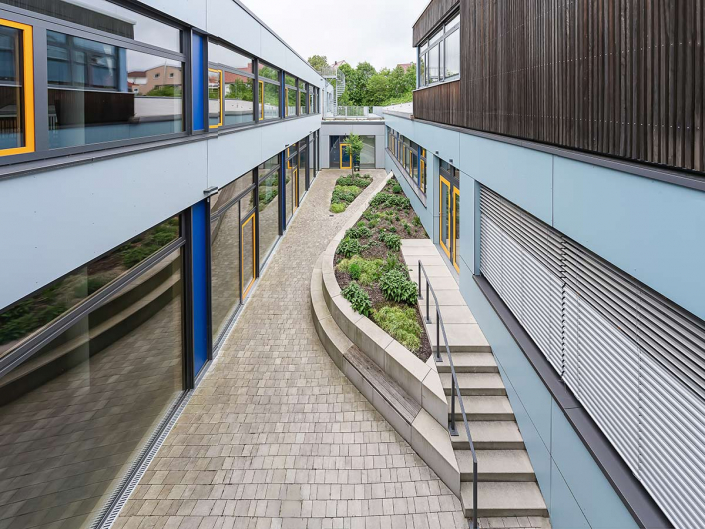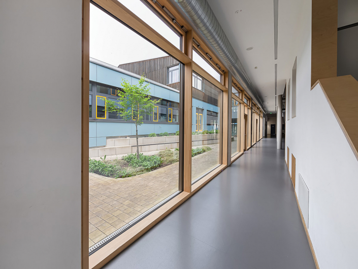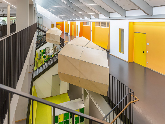 Durch den Neubau der Aula wurde der Haupteingang neu markiert und mit einer zentralen Halle wurden die Blickverbindungen zu den Erweiterungsgebäuden verbessert. In der mehrgeschossigen Halle sind zudem Rückzugs- und Arbeitsflächen mit Blickbeziehungen in die Klassenräumen entstanden. Das Brandschutzkonzept wurde dahingehend gestaltet, dass diese Flure und die zentrale Aula keine notwendigen Flure mehr sein müssen, somit sind dort in Zukunft Aufenthaltsbereiche möglich. Die gesamte Maßnahme inkl. Neubau der Aula wurde in drei Bauabschnitten während des laufenden Betriebs umgesetzt.
